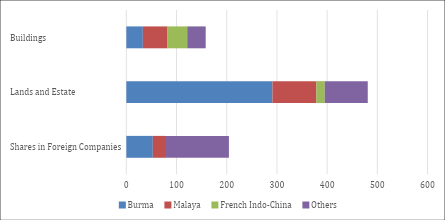 Yet, despite the inter-war-period dislocation and war-time destruction and expropriation, Indian investments in Southeast Asia remained considerable. The first survey of Indian investments abroad was carried out by the Reserve Bank of India (RBI) in 1948. Total Indian capital abroad (accounting for only formal economy) was close to ₹1 billion (S$16.2 million). For reference, the total annual outlay for the First Indian Five-Year Plan was just ₹4 billion (S$64.8 million). Of Indian investments abroad more than 60 per cent were in Southeast Asia, totalling ₹598.93 million (S$9.7 million). This data does not include Indian nationals who held tax residency in Southeast Asia at the time. The bulk of this money was tied up in Burma (₹382.13 million) (S$6.19 million), followed by Malaya (₹161.1 million) (S$2.61 million) and Vietnam (₹55.7 million) (S$0.9 million).[6] The distribution of asset classes can be seen below: